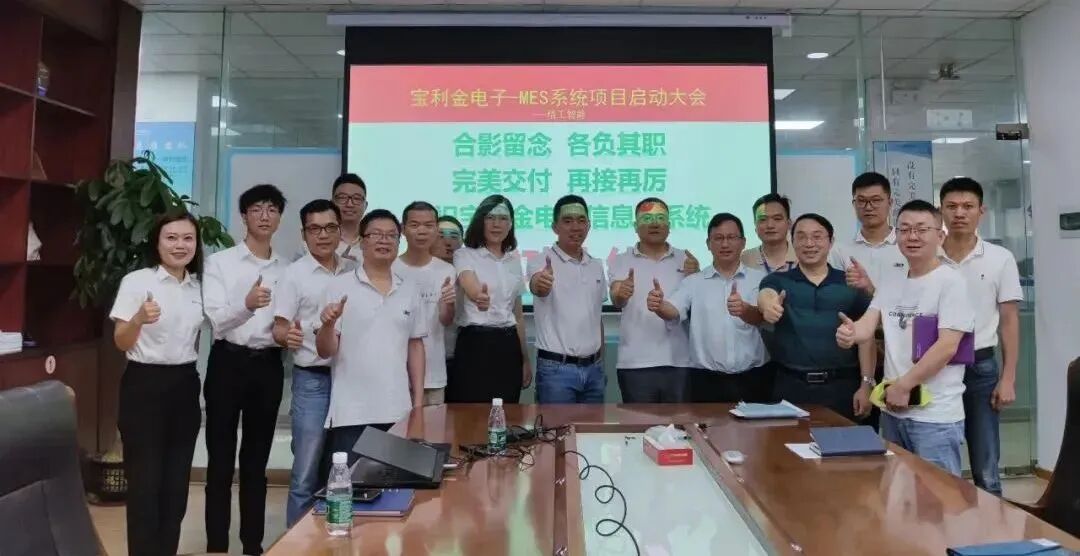 2022年5月27日,中山市宝利金电子有限公司(简称“宝利金”)MES5.9项目启动会大会顺利召开。宝利金总经理庞里生、精工智能战略发展中心副总经理王晓燕、 项目总监汪昭赢、项目经理苏梓聪与项目组其他成员共同参加了本次启动大会。