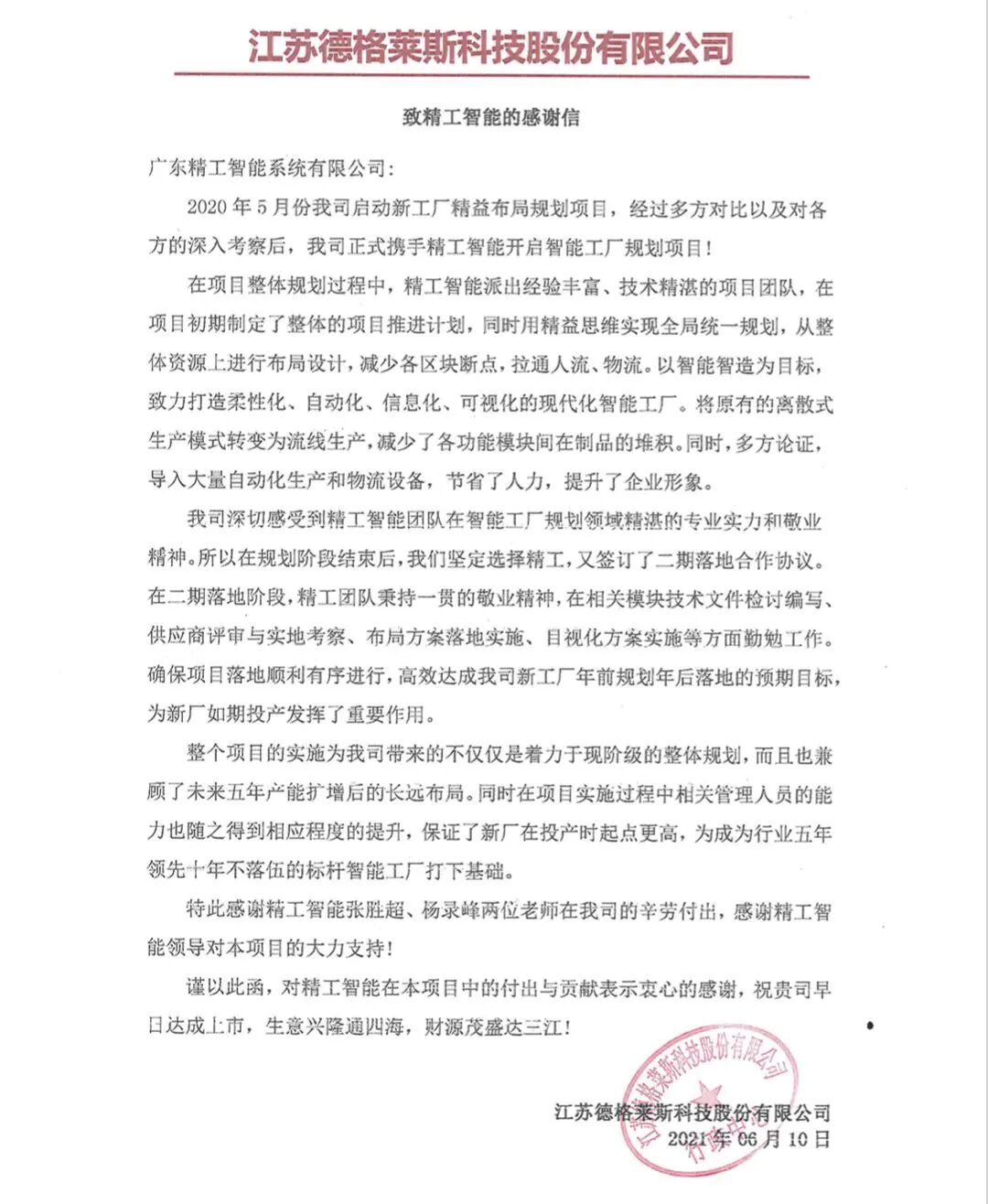 6月10日,精工智能收到了一封来自江苏德格莱斯科技股份有限公司的感谢信,信中表达了德格莱斯对精工智能在智能工厂规划项目中的付出与贡献表示最衷心的感谢,充分肯定了精工智能团队关于智能工厂规划精湛的专业水平。