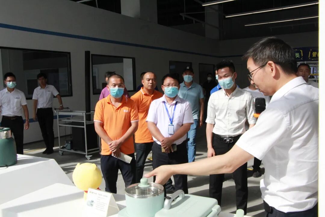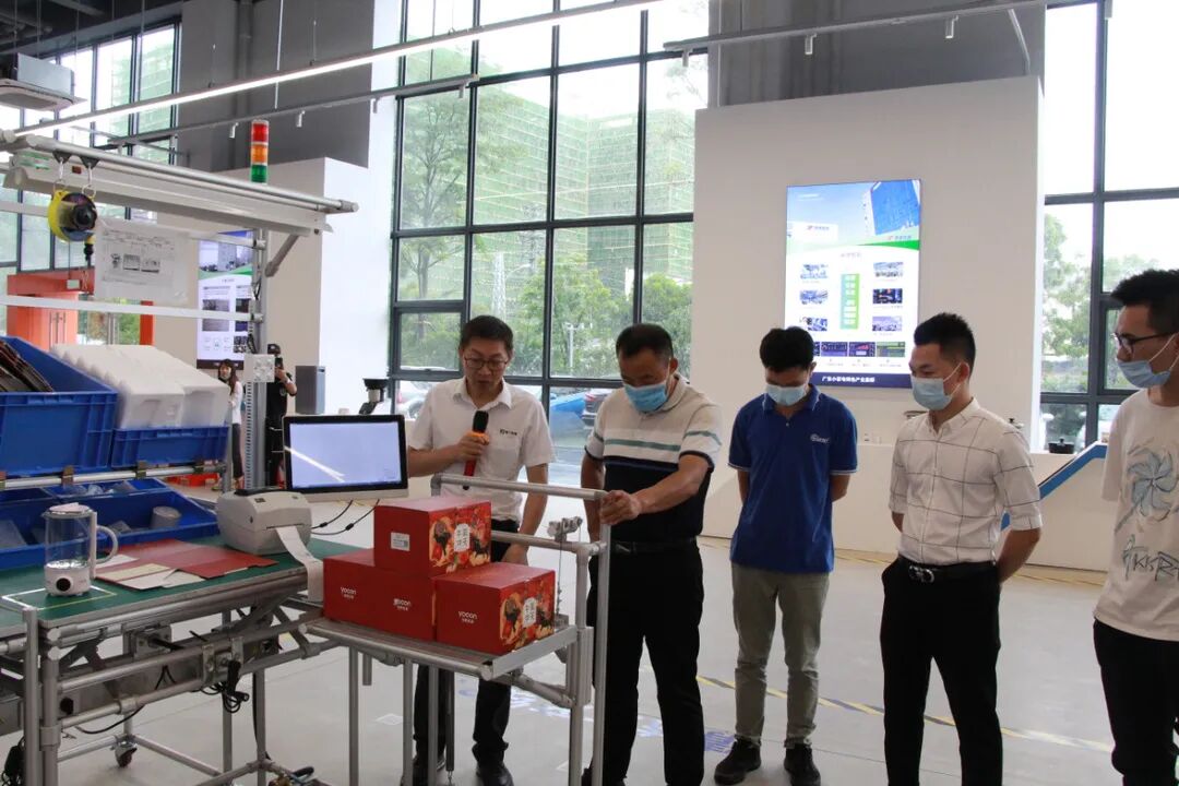 宋老师具体向大家介绍了创新中心的数智柔性单元线,它融合了单元线、低成本自动化、工业互联网、物联网和精益防呆防错理念。宋老师向大家解释到:"可以1人或3人或5人就可以组装一个迷你养生壶小家电产品,线体长度不到5米,物料通过AGV线边仓配送,人机结合站立式作业。"