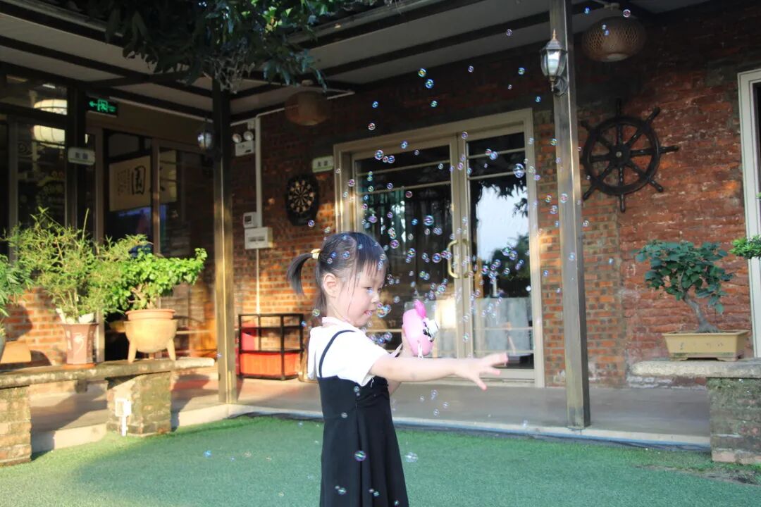 阳光洒落西边,绿荫的缝隙光影斑驳,小公主无虑旋转着用泡泡机吹出一串泡泡,泡泡七色变幻,小公主脸上洋溢着笑容,旁边的父亲笑得满眼宠溺。