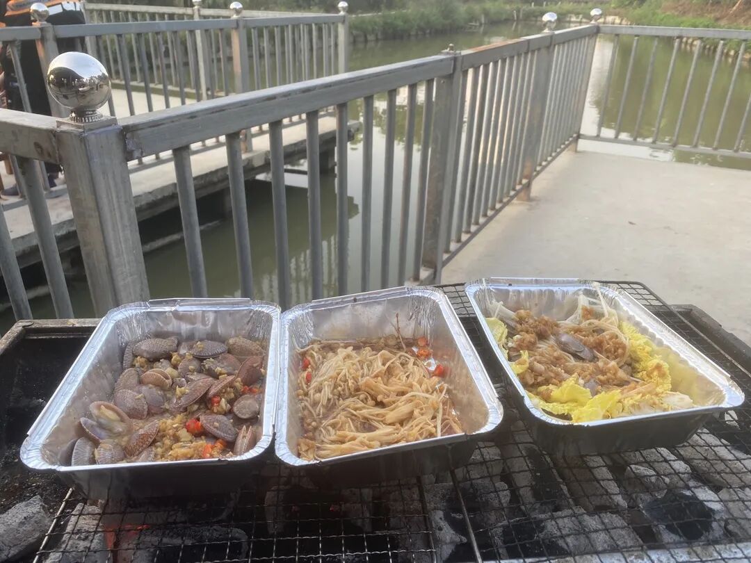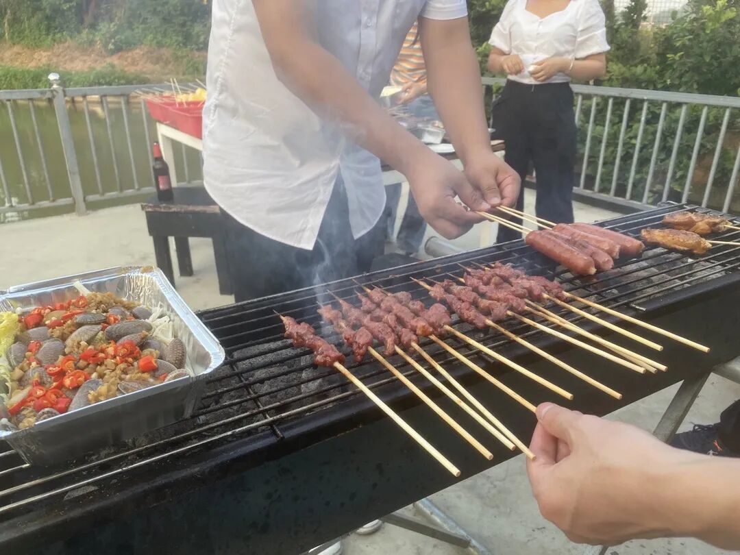 在大家的共同合作下,烧烤纷纷出炉,香味满溢,路过的人们纷纷翘起大拇指说“好香好香”。鸡翅、辣椒、羊肉串、骨肉相连、鱼丸、花甲......大家放开肚子可劲儿吃,个个吃饱喝足。