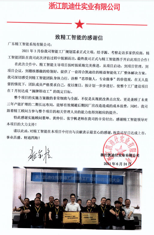 凯迪仕蒋总为精工授荣誉牌,蒋总送给精工一封感谢信,代表了凯迪仕对精工团队的认可。