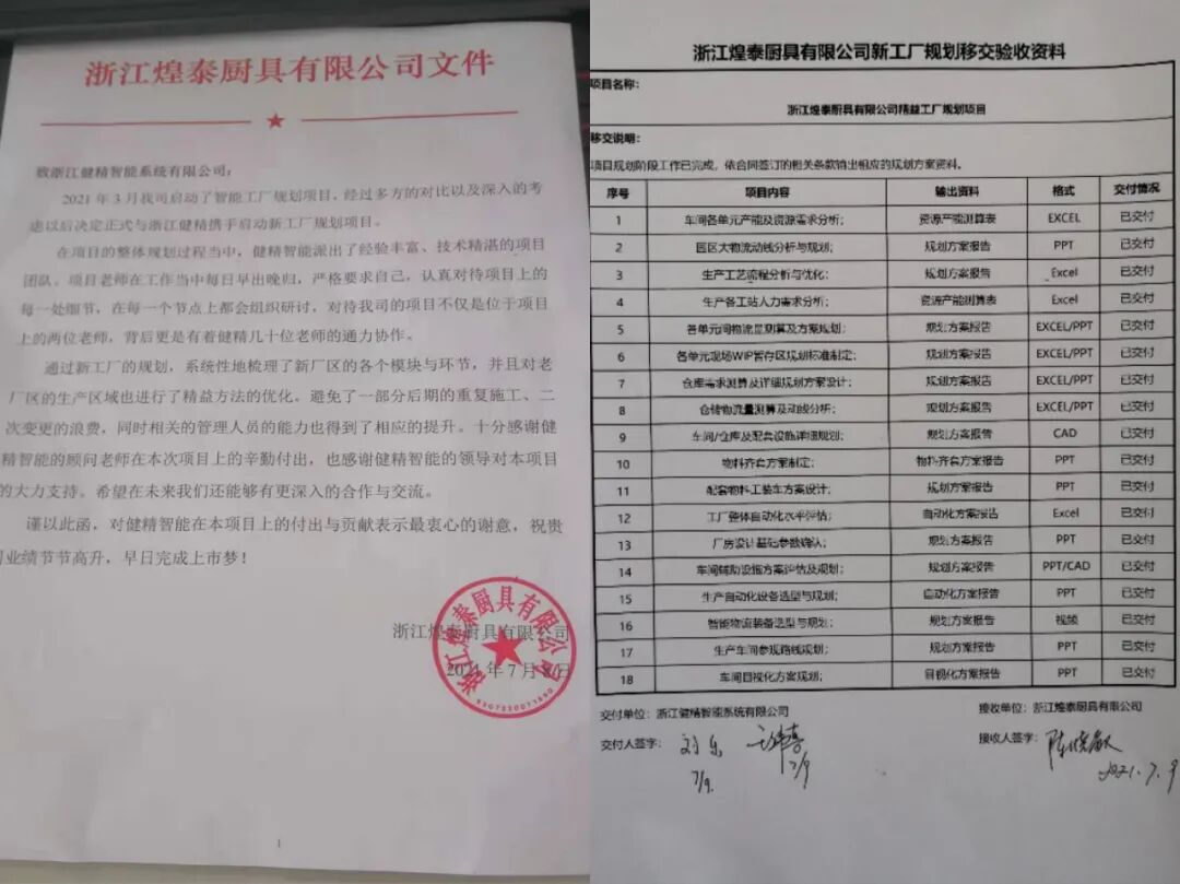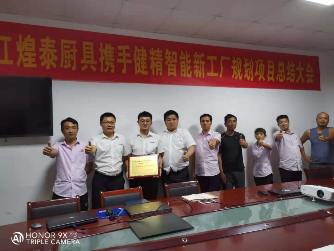 煌泰厨具生产副总陈副总对项目组成员三个月来的努力工作表示感谢,过程中对方案互相沟通讨论,最终大家一起努力制定合理化的布局方案。相信本次与健精智能的合作,能将新工厂的规划布局做到更加专化、更加科学、更具可发展性,未来煌泰厨具的发展之路更加平坦长远,成为烤盘、蛋糕模行业的领头羊。