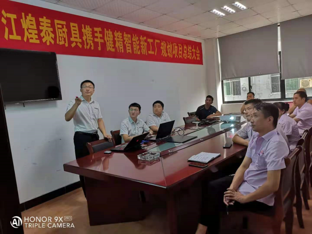 煌泰厨具PMC经理彭经理首先对健精智能团队表示感谢,同时提出项目推行非常顺利,今天是工厂规划阶段的结束,也标志着方案落地阶段的开始,接下来将迎来工厂的实施和落地阶段。我们要提前规划布局,夯实基础,改变思路,加强公司核心竞争力;规避风险,抓住机遇,把煌泰打造成业内标杆企业,争当上游!