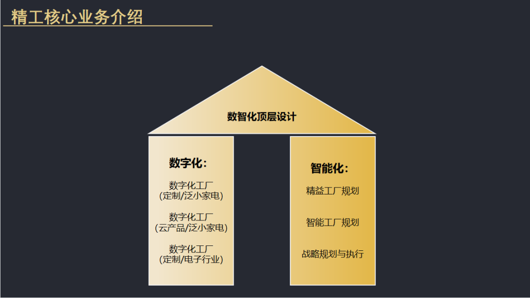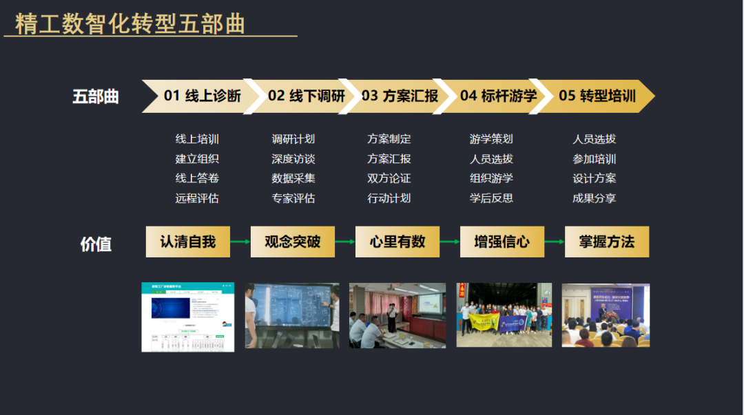 近年来,广东精工智能系统有限公司根据国家智能制造成熟度评估模型,并结合数十年企业咨询和诊断的经验,推出四大核心业务:数智化顶层设计方案、智能工厂规划、数字化工厂和工业互联网,其中数智化顶层设计方案独创转型五步曲从战略方向、产品研发、组织建设、管理基础、数智化成熟度对企业进行全面诊断和规划,助力企业家梳理未来3-5年数智化的发展路径和方法。