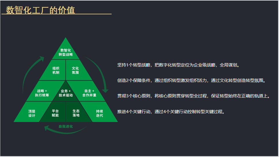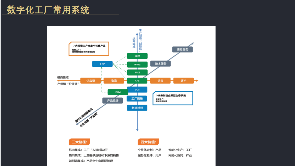 首先丁老师讲解了“数智化”一词的来由,并区别了“数字化”与“智能化”的不同;通过总结第一次工业革命开始涌现出的四代企业家的特点,指出企业的竞争正从”机会导向型”走向”战略牵引型”。随后分析了制造业现状、揭示制造业的痛点以及数智化转型面临的挑战,指出这些变化迫使企业需要做“横向互联与纵向互通”。